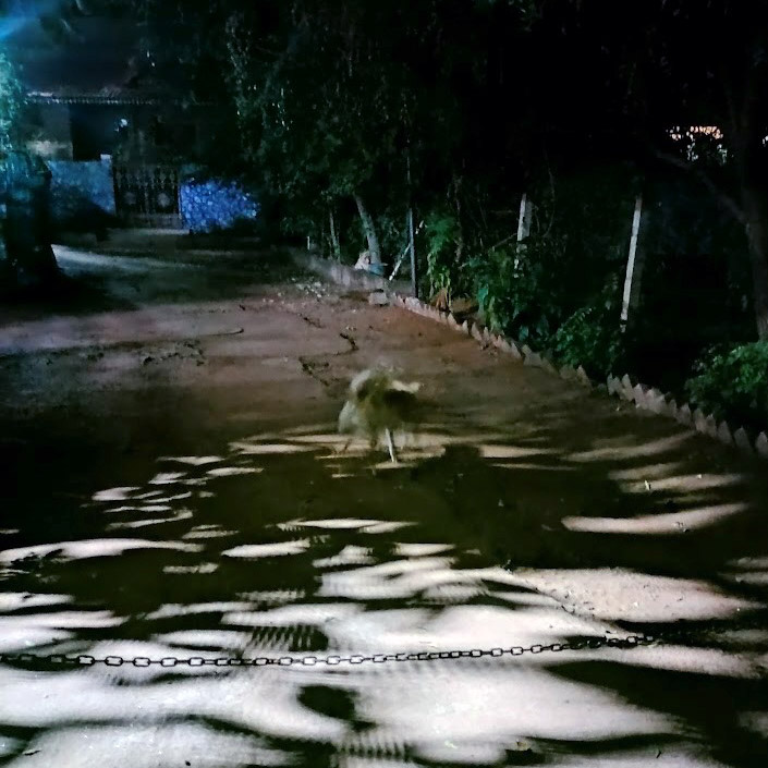 It’s still dark with shadows, screeching of the owls, and the loud calls of the peacocks, scare me. The calming voice of my Human and his presence gets me courage and to venture out.