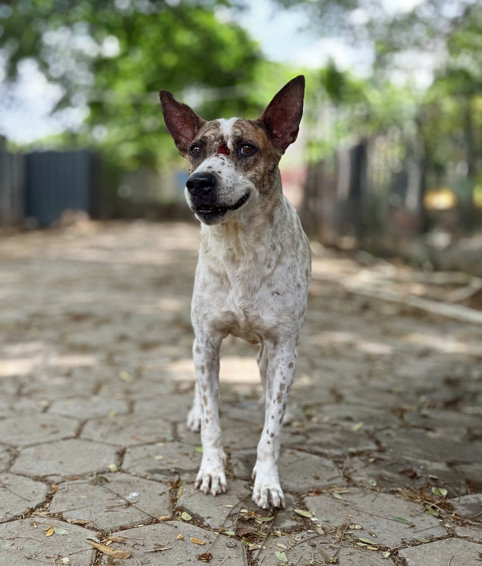 A tlas came to us with a noticeable scar on the bridge of his nose that, after a thorough examination, was found to be the result of basal cell carcinoma. This condition caused a persistent wound that requires management even after the tumor has been removed. A true sweetheart: with his white coat and striking patches, Atlas is as handsome as they come. His calm and loving nature towards everyone he meets makes him a wonderful pet for a caring family.