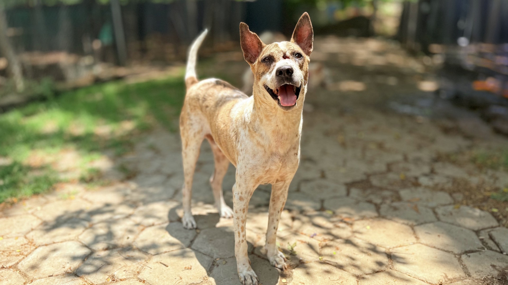 A tlas came to us with a noticeable scar on the bridge of his nose that, after a thorough examination, was found to be the result of basal cell carcinoma. This condition caused a persistent wound that requires management even after the tumor has been removed. A true sweetheart: with his white coat and striking patches, Atlas is as handsome as they come. His calm and loving nature towards everyone he meets makes him a wonderful pet for a caring family.